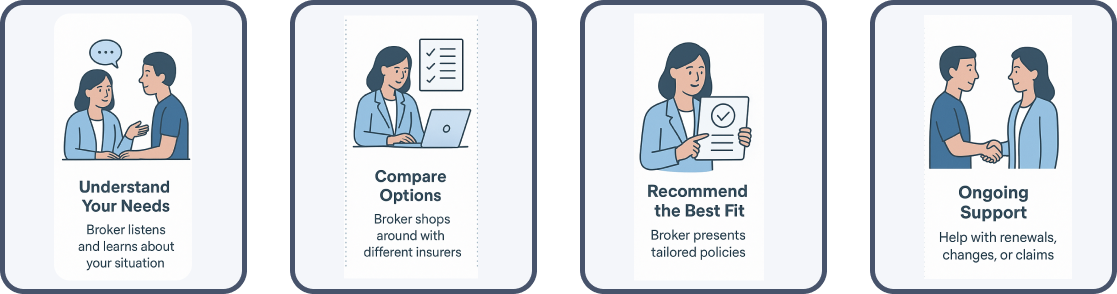 An insurance broker acts as your trusted advisor, helping you find the right coverage at the best price. Unlike agents who work for a single insurer, brokers work for you — comparing policies from multiple companies, explaining options in plain language, and guiding you through claims if you ever need to use your insurance.